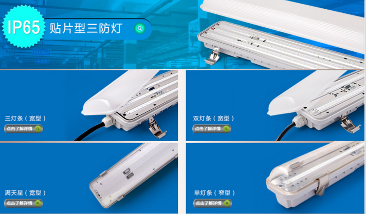 释义:三防荧光灯即防水,防尘,防腐。方言:防水灯或防尘灯。
